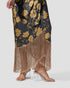 تنورة ميدي ملفوفة بخصر عالٍ، مزينة بطبعة زهور تغطيها بالكامل. حاشية غير متماثلة مع تفاصيل شراشيب طويلة. إغلاق ذاتي عند الخصر. قماش ناعم بلمسة نهائية من الساتان.