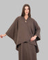 بلوزة واسعة بتصميم بونشو انسيابي وقصة مريحة. تتميز بفتحة رقبة على شكل حرف V مزينة بزر معدني أنيق. أكمام واسعة منسدلة وحافة غير متماثلة لإطلالة عصرية انسيابية. مصنوعة من قماش ذي ملمس مميز بنقشة خطوط رفيعة دقيقة. مصممة لسهولة تنسيقها مع قطع أخرى ولإطلالة يومية راقية.